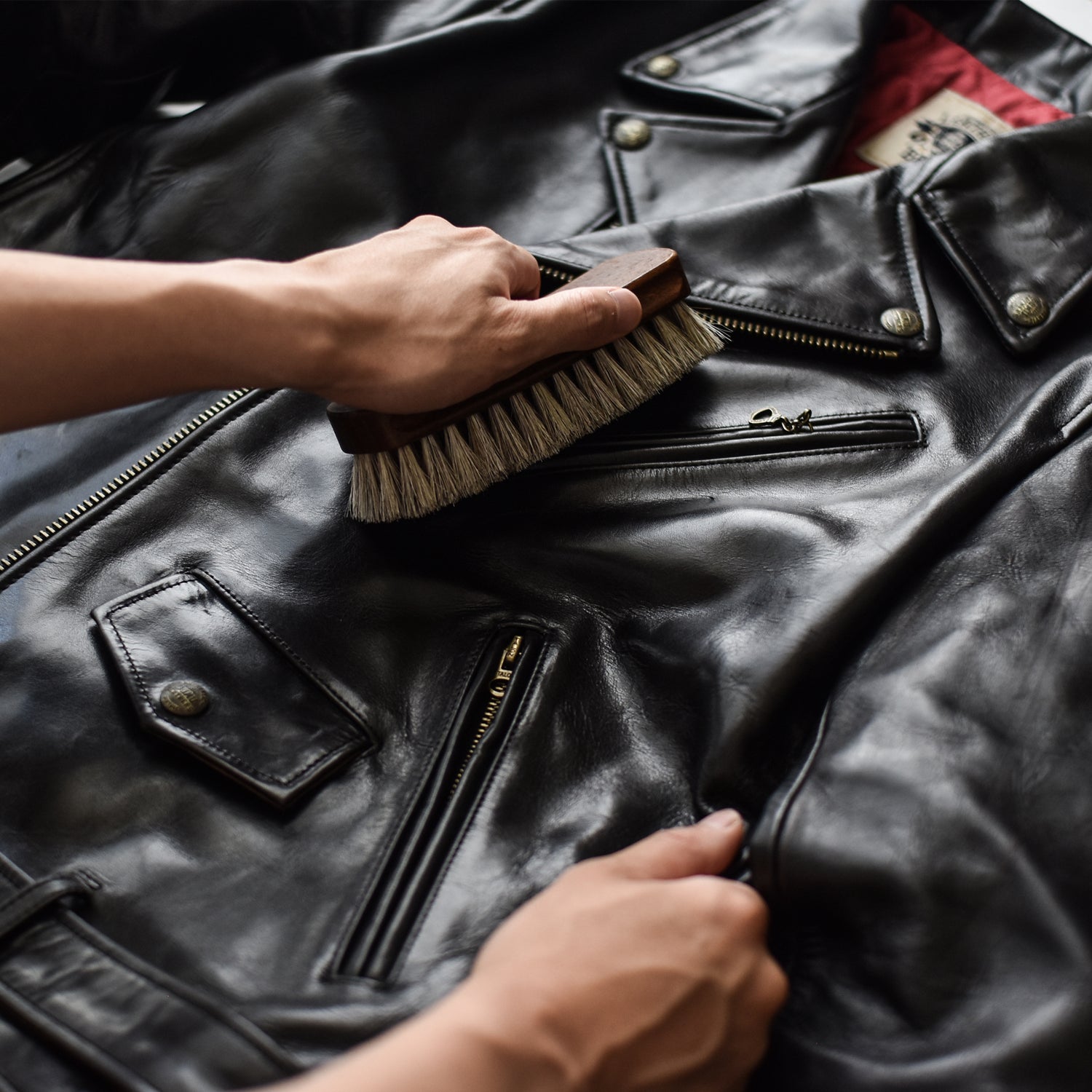 しかし普段のお手入れとしては、ブラッシングのみで十分です。着用後に専用の馬毛ブラシなどで、さっとブラッシングをすることでゴミや埃を落とし、カビや汚れの原因を軽減してくれます。半年1年ほど着用し、革が少し乾燥してきたと感じた場合は専用のクリームを使ってお手入れを行なってください。